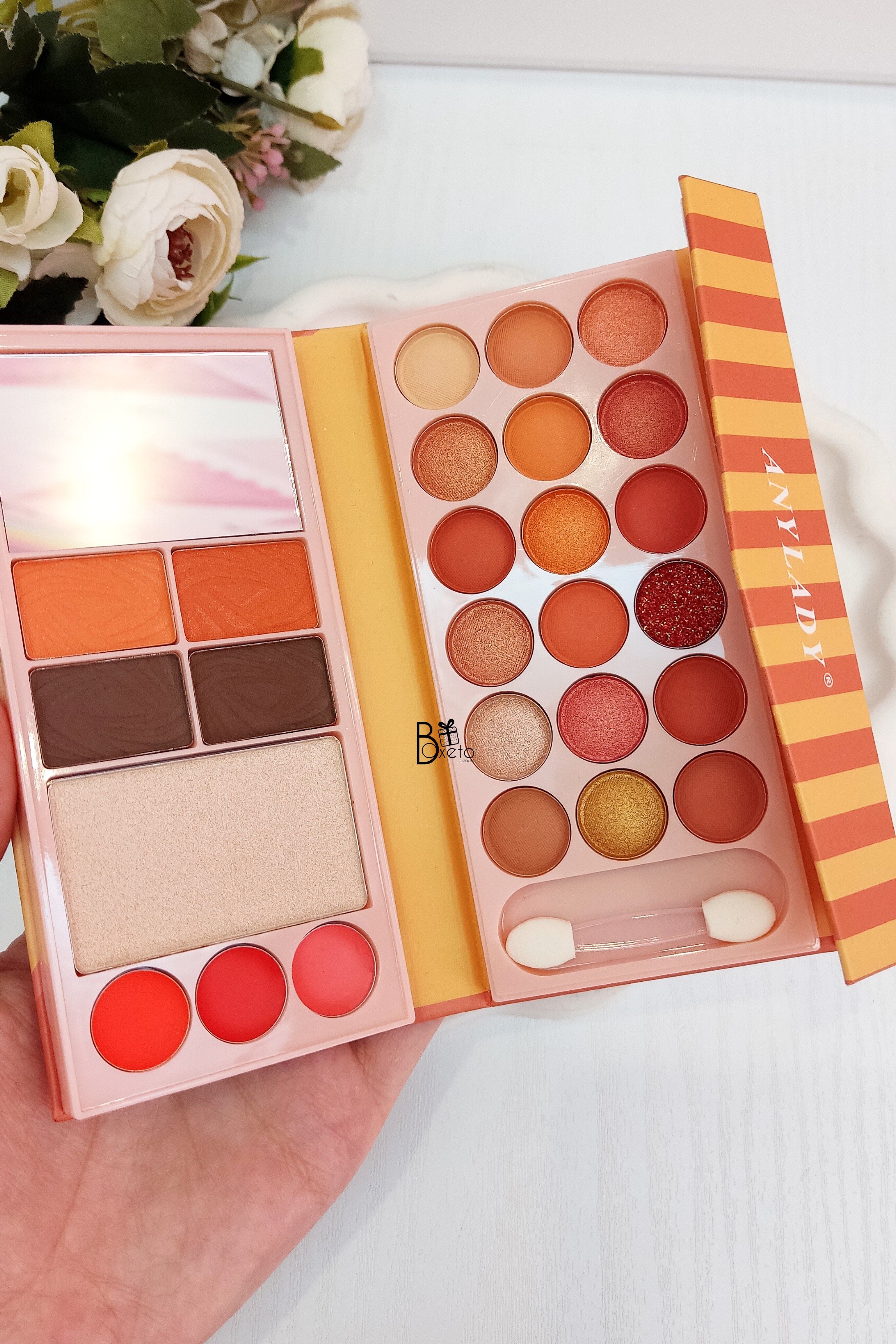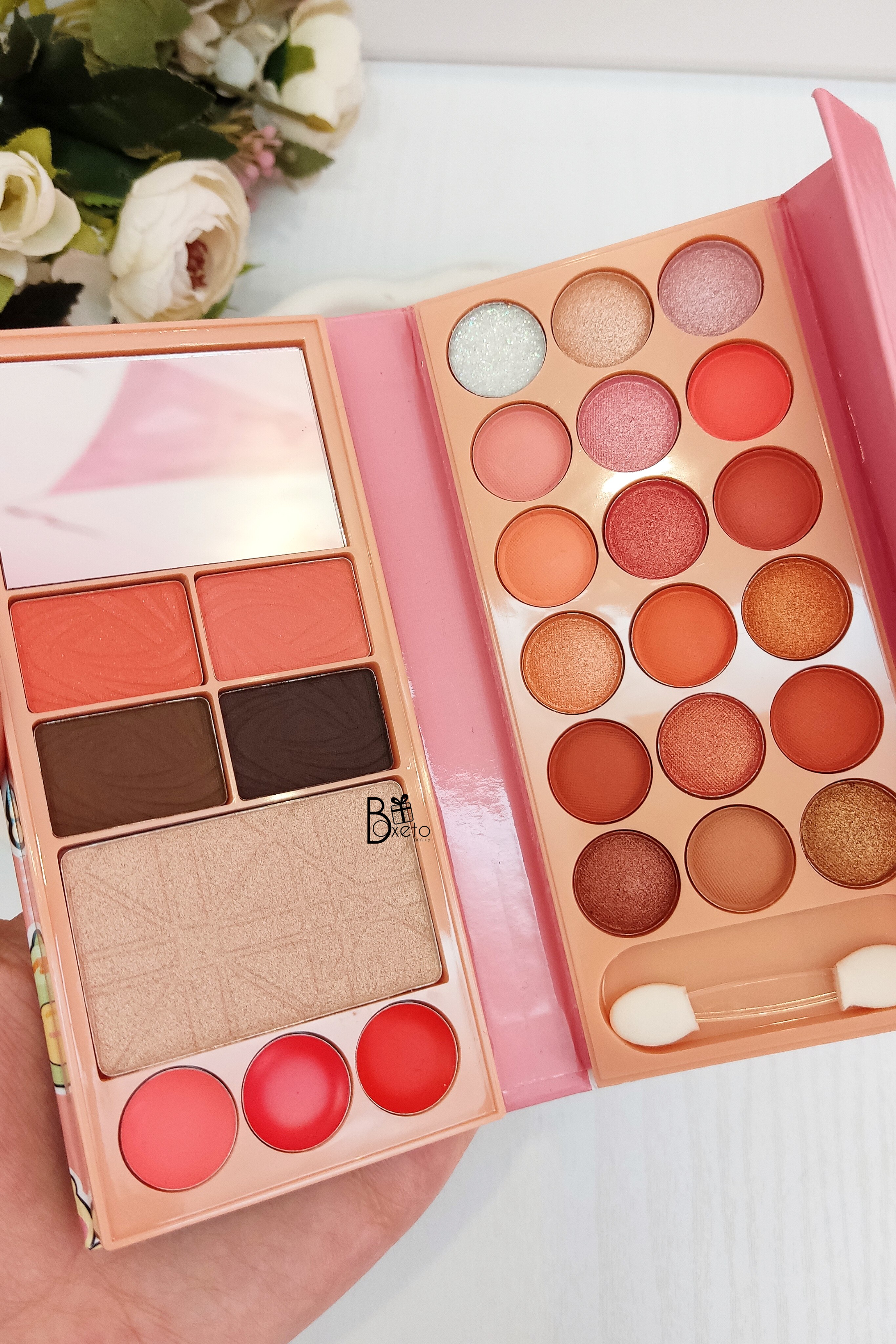 ۱۸ رنگ سایه ، ۳ رنگ رژلب ، ۲ رنگ کانتور (به عنوان سایه ابرو هم استفاده میشه)، ۲ رنگ رژگونه ، ۱ رنگ هایلایتر، ۱ براش اسفنجی